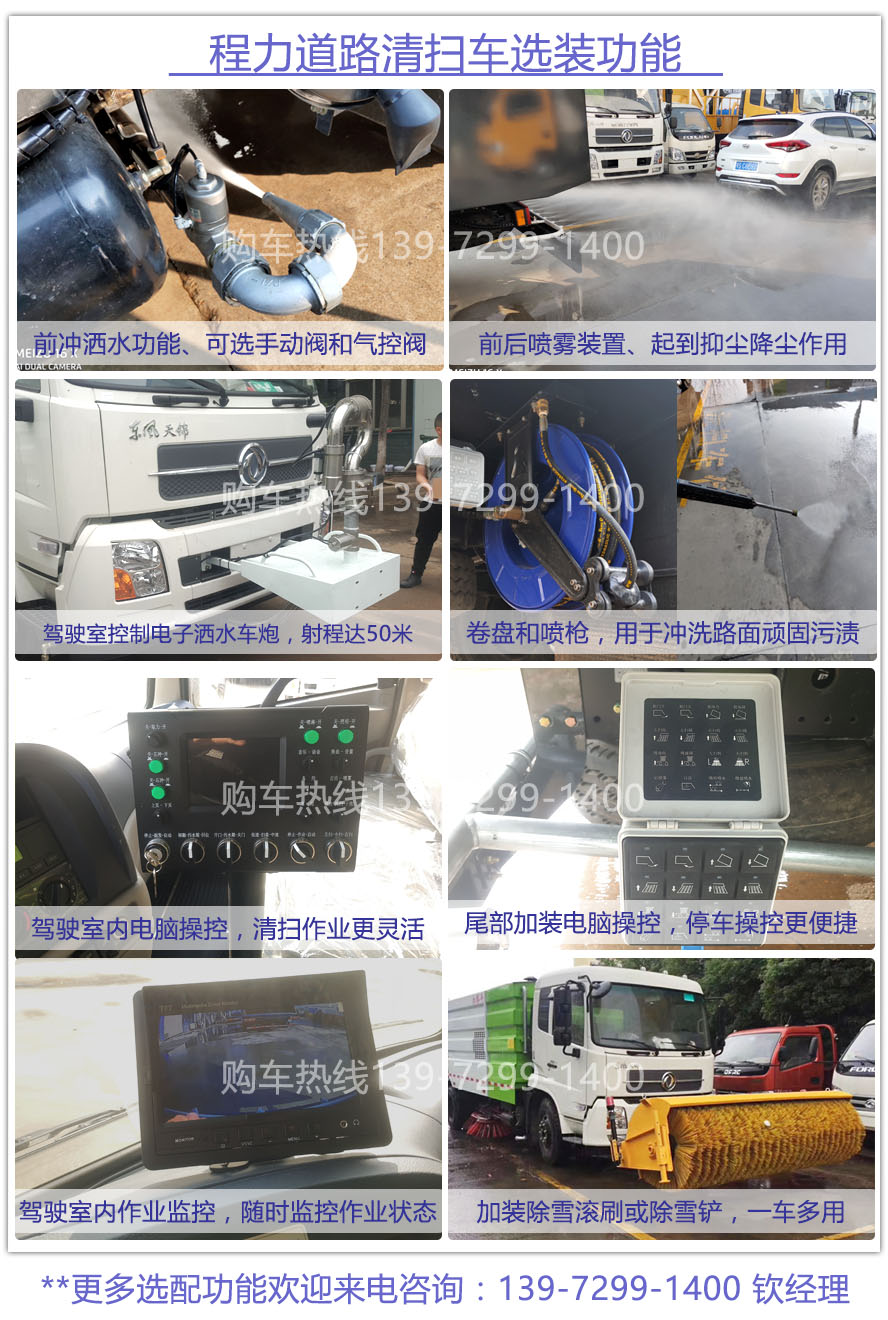 三、選裝配置: 選裝倒車和左右掃影像;選配前沖后灑、杭州威龍灑水泵,前置綠化炮、前后噴霧;選裝自潔帶卷盤;副水箱加大;手持吸塵管;低水位報警系統。3308以上車型可加裝除雪滾和雪鏟。
