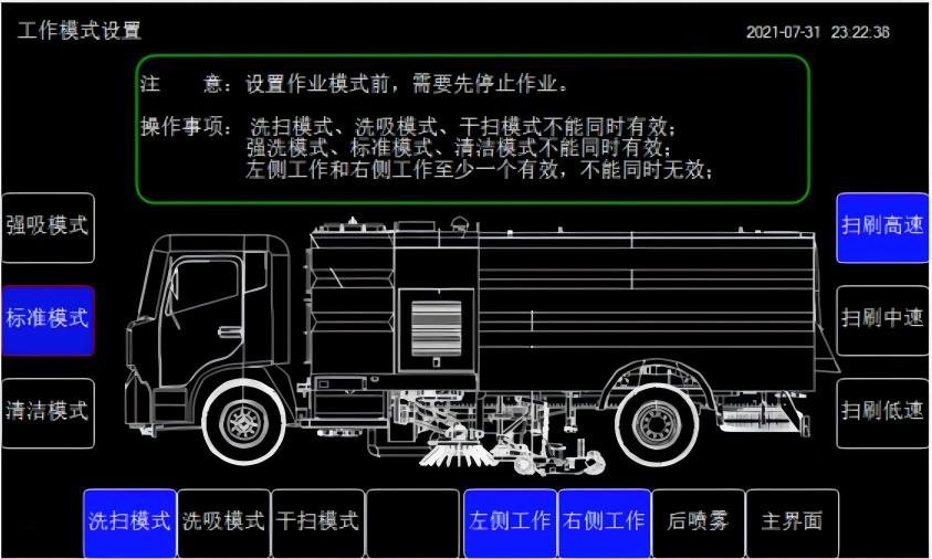 路沿和路沿石立面洗刷:利用掃盤的左或右立掃,左或右噴桿上的路沿石清洗噴嘴,選用左或右洗掃作業模式進行洗掃作業,就可對左或右路沿與路沿石立面進行洗刷作業。