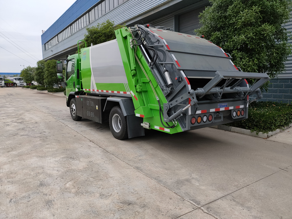 6. 方便的操作控制,作業控制盒分別安裝在駕駛室內和車尾右側,左側帶緊急停止按鈕,配備遙控器,駕駛室內的作業控制盒可控制推擠卸料和選擇操作模式(如自動或手動),車尾的作業控制盒則控制壓填機構和翻桶機構的作業,使用操作十分方便。特別是在垃圾填埋場,作業人員無須下車即可完成卸料和污水排放。