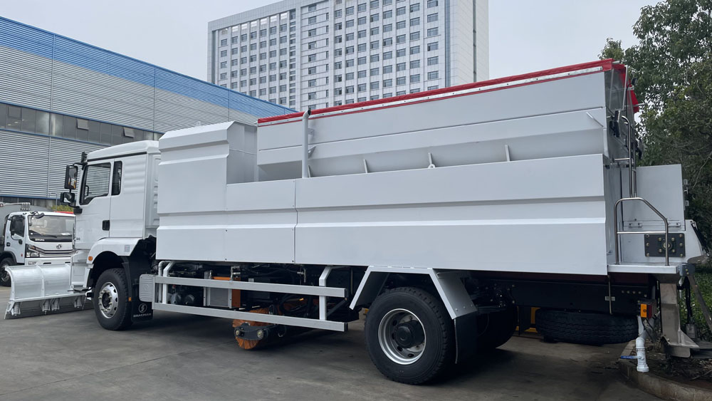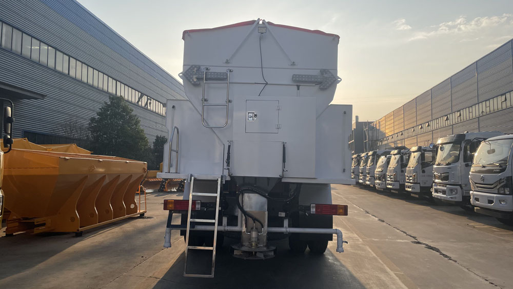 - 后置融雪撒布機(jī):車輛尾部配備融雪撒布機(jī),在冬季除雪過(guò)程中拋灑融雪劑,防止?jié)窕穆访娼Y(jié)冰影響交通,覆蓋過(guò)融雪劑的路面能很好地解決路面結(jié)冰問(wèn)題,使車輛安全通過(guò),不受天氣影響 。