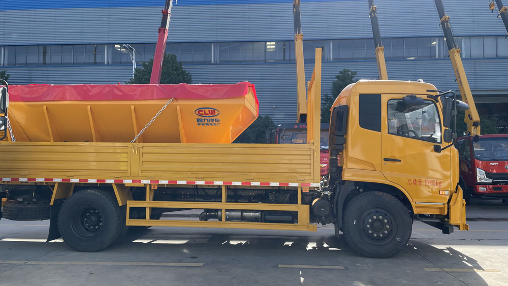 一、底盤配置: 采用東風(fēng)天錦DFH1180EX8車身,配置玉柴D6.7NS6B230發(fā)動(dòng)機(jī)169/230馬力,國(guó)六排放標(biāo)準(zhǔn),軸距4200,4500,4700,(mm),整備質(zhì)量9噸,額定載質(zhì)量8.805噸,五擋變速箱,帶動(dòng)力轉(zhuǎn)向,帶原廠空調(diào),該車用于冬季撒布融雪劑;專用裝置為撒布機(jī), 2.前伸尺寸均為160mm; 3.側(cè)防護(hù)所用材料為Q235,連接方式為焊接,后部防護(hù)所用材料為Q235,離地高度為400mm; 該車上黃牌,城區(qū)道路請(qǐng)注意限行標(biāo)識(shí)。